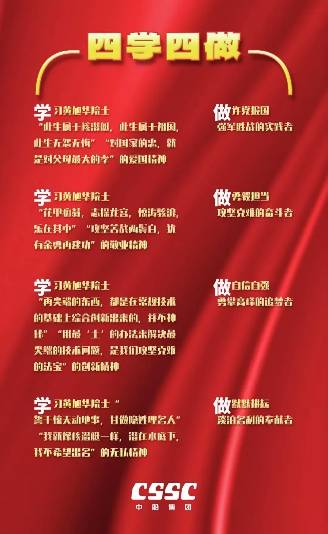 近日,中船集團黨組下發(fā)通知,號召全集團深入開展黃旭華院士先進事跡“四學四做”活動。公司全體員工要深入學習宣傳黃旭華院士先進事跡、優(yōu)秀品格和優(yōu)良作風,繼承黃旭華院士遺志,弘揚核潛艇精神,賡續(xù)中船文化,在新時代新征程中,爭做對黨忠誠、對事業(yè)執(zhí)著的奮進中船人,自覺將個人奮斗融入到中船集團發(fā)展大局中,切實將學習活動成效轉化為完成全年任務目標、推動“十四五”圓滿收官的實際成效。